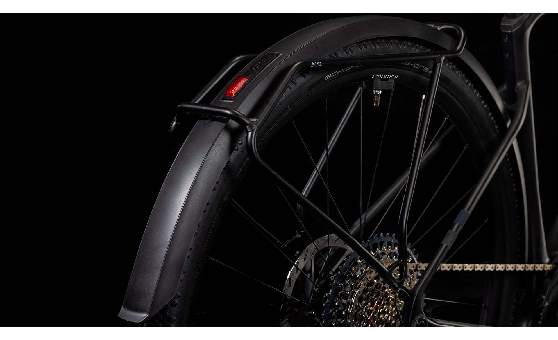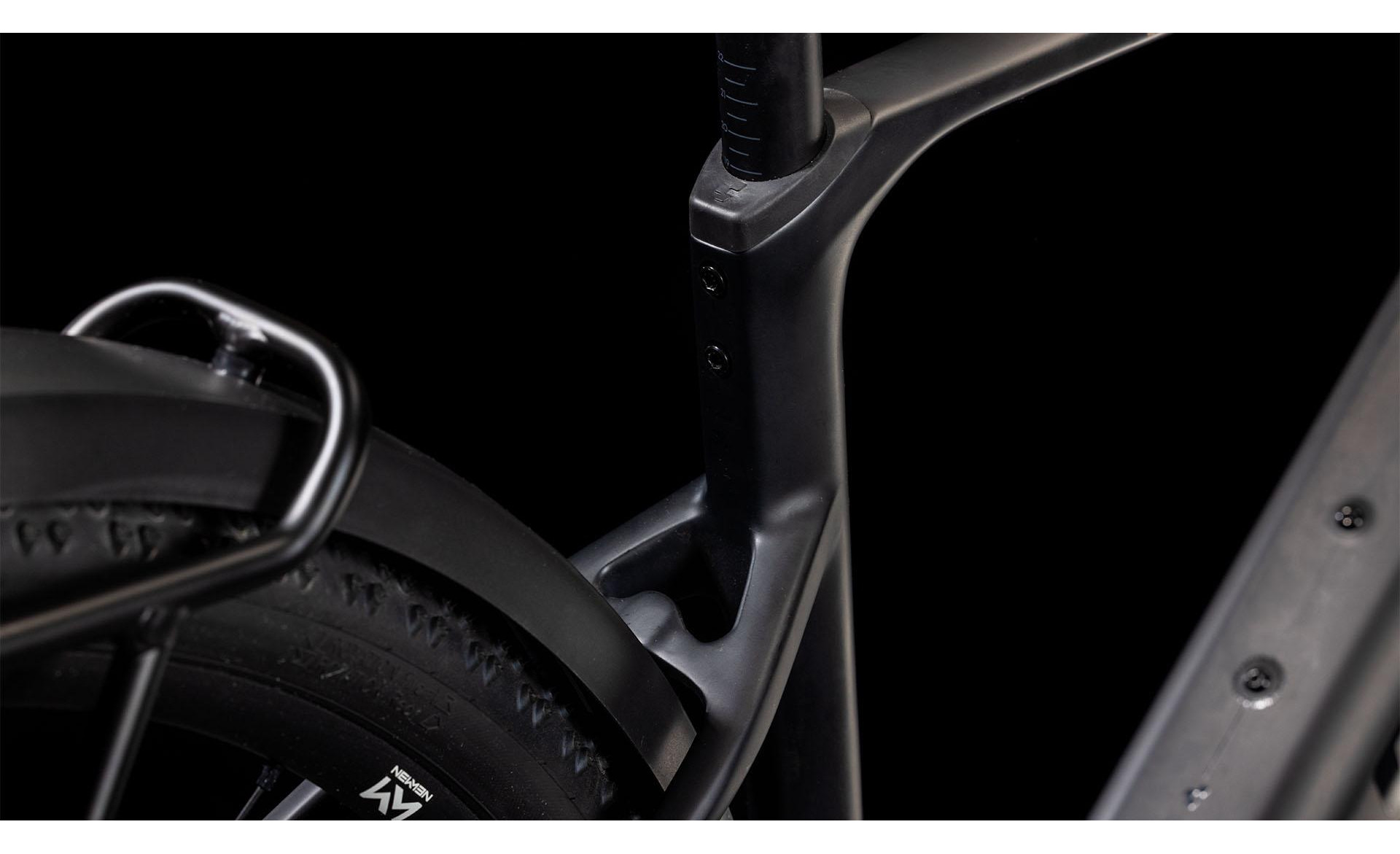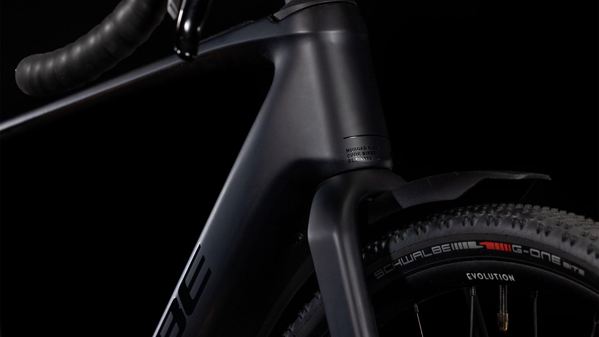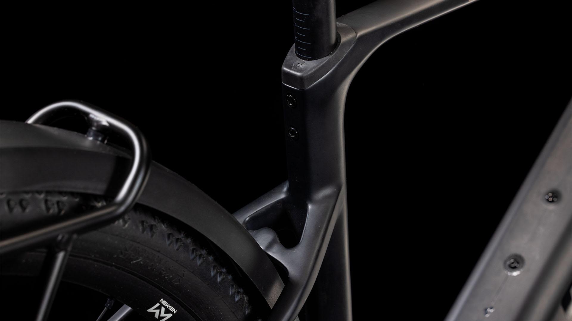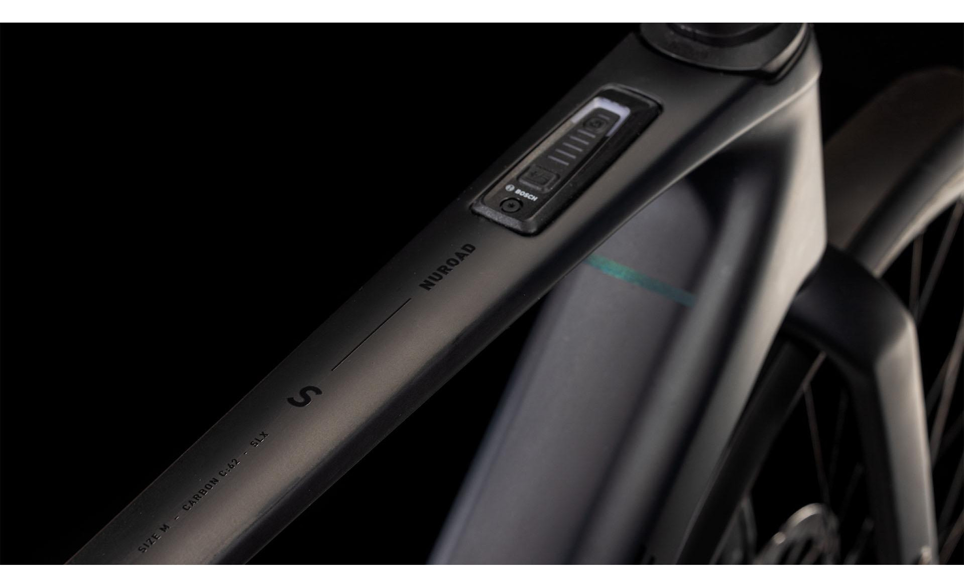 Concevoir un cadre réellement pratique ne se limite pas à fixer des garde-boue et un porte-bagages, même si cela fait partie des choses que nous avons faites. Le cadre élégamment sculpté du Nuroad Hybrid C:62 FE présente de nombreuses touches subtiles, telles que son aptitude à être équipé de pneus de 50 mm, même en présence de garde-boue. Sa fourche tout en carbone présente des supports de fixation pour garde-boue, nous l’avons équipé d’un guide de chaîne Direct Mount léger, d’une interface de béquille Flatmount, et sa base arrière est équipée d’un axe arrière Boost et d’une patte de dérailleur UDH. Pour ce qui est de son unité motrice Bosch, elle est compatible avec le booster PowerMore et permet donc de bénéficier d’une batterie de 250 Wh supplémentaire, tandis que l’unité de commande est soigneusement incorporée dans le tube supérieur, avec un léger déport sur le cintre. Nous avons soigné les détails, de sorte que vous puissiez vous concentrer sur vos coups de pédale.